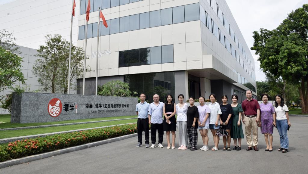上午9时,晏向华一行前往海南(潭牛)文昌鸡股份有限公司,与公司董事长于吉英、总经理张旭丽、种禽事业部总监王秀萍等人座谈交流。针对当前本科生专业思想不牢固、行业认可度有待提升的情况,晏向华建议可以通过开展党建联学活动,邀请企业带头人讲述创业史、增加实习实践专业导学等方面,在人才培养和校企合作上进一步深化合作交流,引导更多农牧学子扎根基层,强农兴牧。随后,在王秀萍的带领下,晏向华等人走入公司展厅深入了解公司发展史和品牌文化,王秀萍详细介绍了公司从孵化培育到加工成预制品的生产全覆盖发展模式,并就企业核心竞争力文昌鸡育种情况与晏向华等人展开探讨交流。晏向华一行对企业的热情接待和积极交流合作表示感谢,也对企业提供的实习机会和未来校企合作更近一层次提出新的展望,期冀在未来学校的理论授课能与企业与实际生产结合得更紧密,实现优势互补,让实践与理论相辅相成。