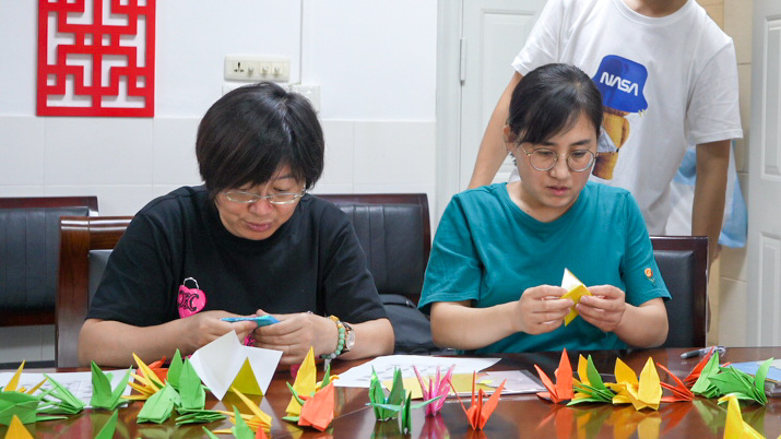 毕业年级辅导员程唐煜一边制作着纸鹤一边说:“纸鹤寓意着展翅高飞,祝愿毕业生们都能够不坠青云之志,不负年少芳华。”