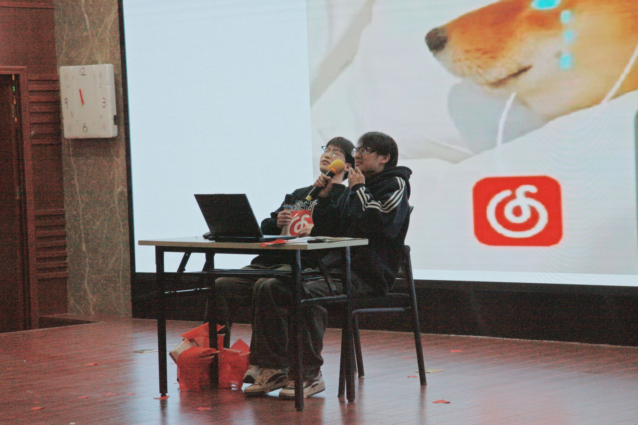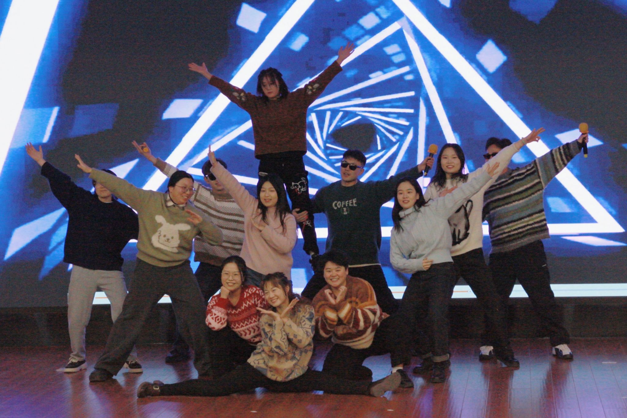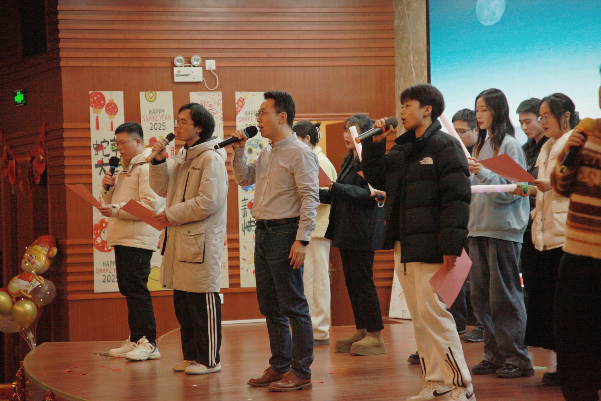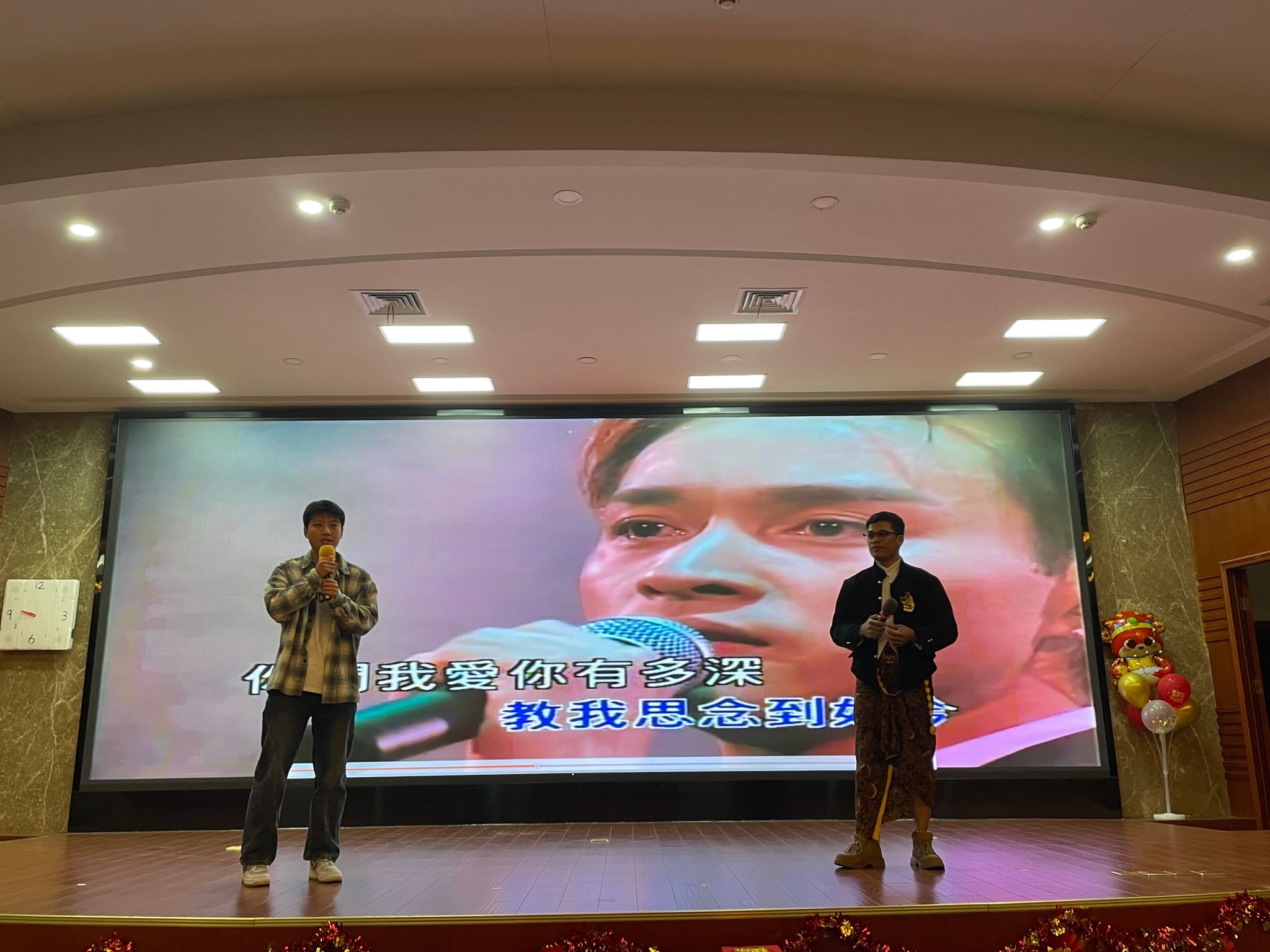 晚上7点,联欢会在2024年实验室的回忆视频中拉开帷幕。主持人闪亮登场,隆重宣布晚会正式开始。陈颖钰老师和学生带来舞蹈《你要跳舞吗》,以其欢快至极的节奏和充满激情的舞蹈,如同一把炽热的火焰,瞬间点燃现场的气氛。紧接着,短剧《研究生的名义》用幽默诙谐的方式围绕“学术诚信”这一主题,生动展示了“学术有道,诚信为本”的重要性。博一和博二研究生联合带来的配音秀更是引得观众爆笑不止,演员们用《激战江南》和《甄嬛传》的经典片段作脚本,混合运用普通话和各地方言,惟妙惟肖地演绎了学生们在组会进展汇报中未准备PPT,情急之下拷贝一个3kb文件的尴尬。舞蹈串烧《CONO+大哥大》充满活力,再次点燃了现场热情。王铎和留学生陶飞(Taufik)深情合唱《月亮代表我的心》惊艳全场。歌舞《恭喜发财》将晚会的新年喜庆氛围推向高潮。2024届新生演绎的小品《时间都去哪了》,生动诙谐且妙趣横生地讲述了学生们难以抗拒手机诱惑,让时间在不经意间悄然流逝而陷入无法完成导师布置任务的纠结与挣扎之中的情景。张磊老师和博士团队带来的大合唱《不要慌,太阳下山有月光》以饱含情感的治愈嗓音将这首鼓励人们在困境中保持希望、相信未来美好的歌曲演绎得淋漓尽致,深深触动了在场每一个人的心弦。