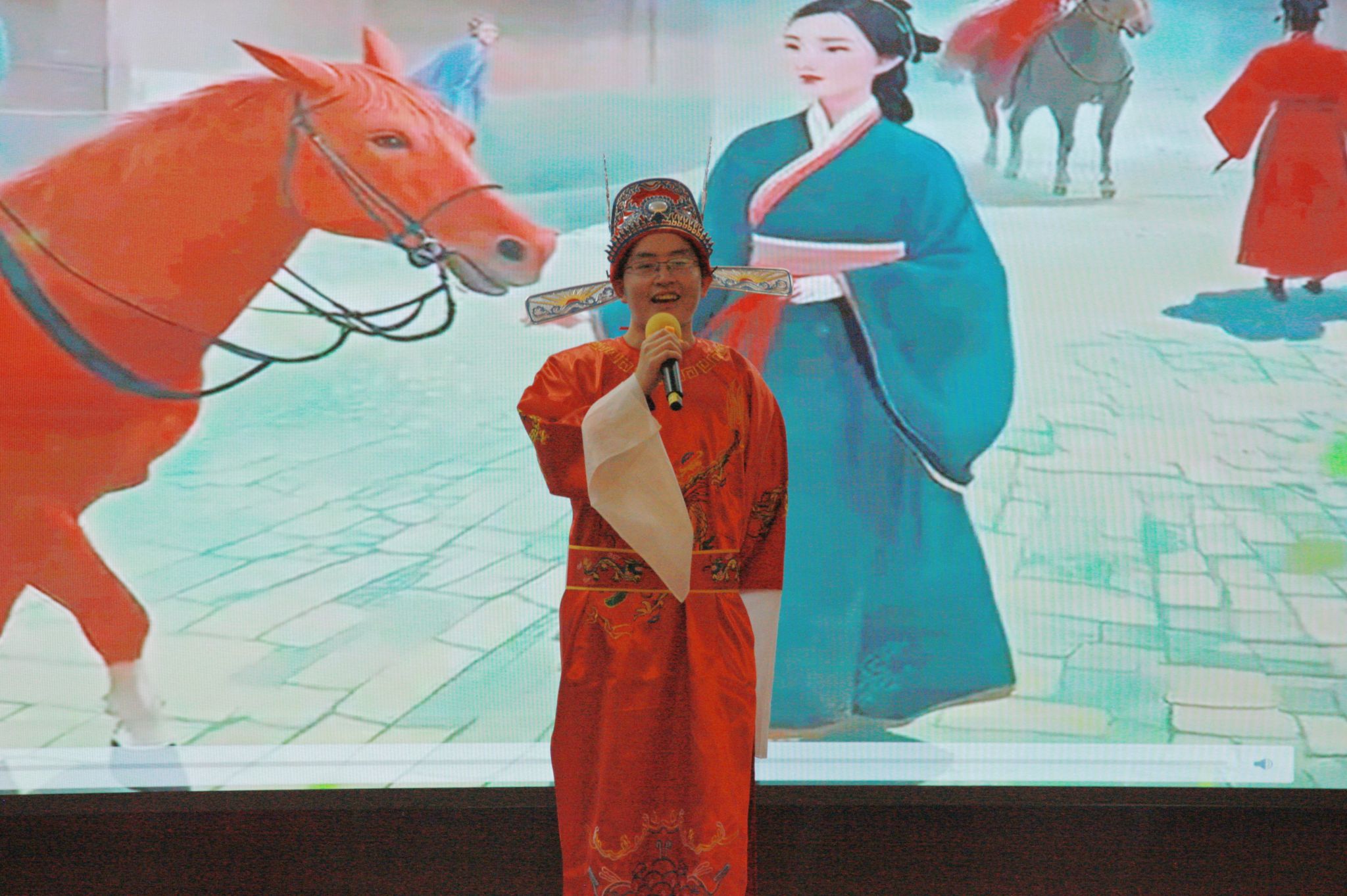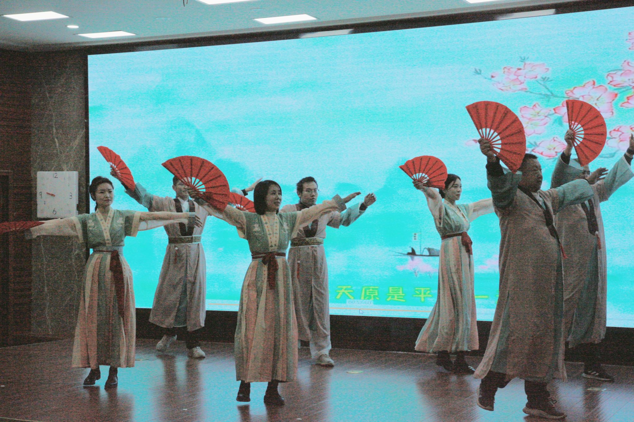 湖北省动物疫病预防控制中心团队带来了《上春山》、《相约在春天》、《女驸马》、《小鸡强强+猪猪楚楚》和《兽医卷王》等5个精彩节目。《上春山》舞蹈表演中,演员们身着淡绿色和米色的传统汉服,折扇在他们的手中如同盛开的花朵,绽放出春天的生机与活力。西藏来汉挂职锻炼的赤列老师身着传统藏族服饰,深情款款演唱的《相约在春天》让观众感受到了藏语歌曲的独特魅力,古装出演的邢潜龙老师一出黄梅戏《女驸马》则让人回味了中华优秀传统文化的深厚底蕴,也感受到了他即将步入婚姻殿堂的喜悦。疫控中心全体成员带来了活力四射、充满兽医人自豪感的舞蹈串烧《小鸡强强+猪猪楚楚》,值得一提的是,“小鸡强强”和“小猪楚楚”是湖北省动物疫病预防控制中心自主设计并担任动物疫病防疫员技能竞赛的吉祥物。改编歌曲《兽医卷王》则以轻松幽默的方式展现了兽医人的日常和奋斗故事。