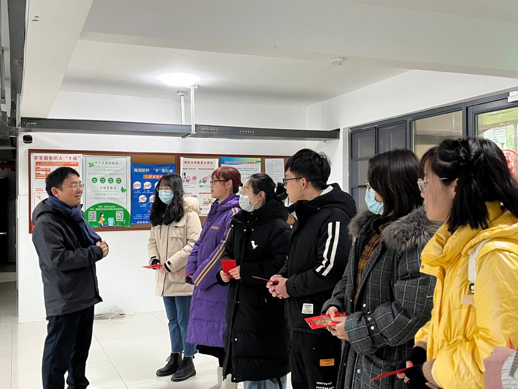 青平表示,正值中华民族传统新春佳节之际,学校十分惦念留校同学,特别是部分同学由于家乡的疫情防控原因不能与亲人团聚。他希望同学们安心留校过年,学校就是同学们的家,老师就是同学们的家人。严建兵嘱咐同学们多参加体育锻炼、发展兴趣爱好、陶冶文化情操,利用假期的“成块儿”时间集中思考学习科研的问题。