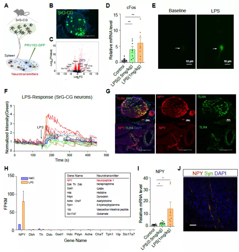 随后研究人员通过钙成像实验,发现 LPS 可以直接激活 SrG-CG 神经元,同时大鼠 SrG-CG 神经元中的 LPS 受体 TLR4 与 NPY 的表达存在共定位现象。这些结果显示 LPS 可以直接激活肾上-腹腔神经节并上调 NPY 的表达水平,这一过程可能在调节脾脏免疫应答反应中发挥重要功能(图 1)。
