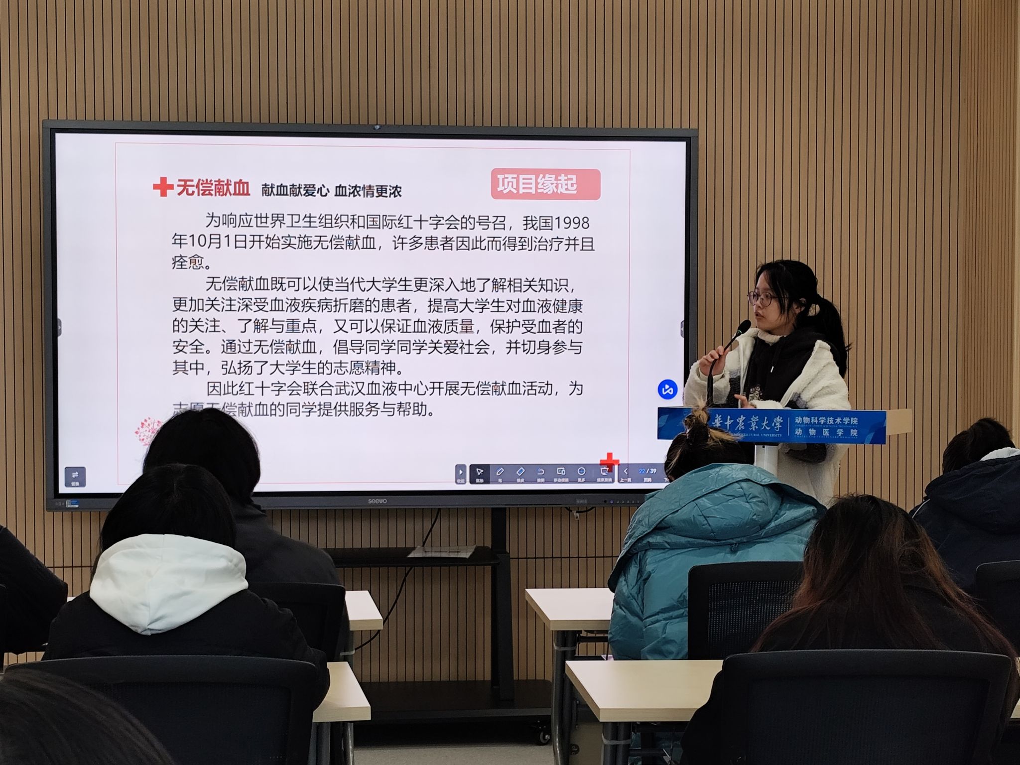 (通讯员:刘子仪 甘宵雨 摄影:郑语佳)12月24日中午,动科动医98堂公益委员培训会在四综B202开展,主题为“公益之棒,代代相传”。此次培训会由动科动医98堂团委青年志愿者工作中心主办,青志负责人程昕逸主持,22级优秀公委孙龙、团委副书记苑金轩、98堂-98色花堂