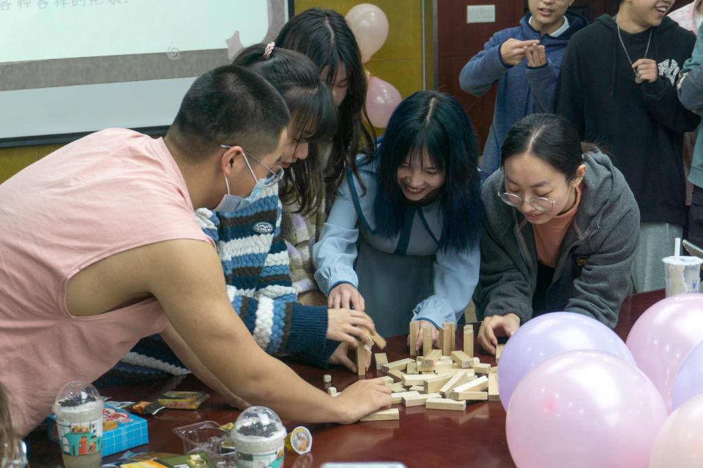 活动伊始,主持人通过组织“抓鸭子”、“拆积木”等游戏调动起全场的热情。随后,观看2021级各班学生们的感恩视频将全场的气氛推向了高潮。短短十几分钟的视频或搞怪、或煽情,承载着下班组成员与2021级学生近一年的深厚情谊。活动最后,2021级班长支书为下班组成员送上了精心准备的礼物并合影留念。
